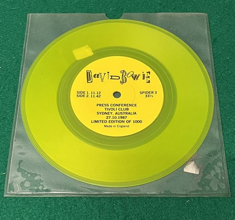 UK 7" yellow vinyl by David Bowie of "Press conference, Tivoli Club, Sydney, Australia 27.10.1987" issued on Spider 3 in 1987, this one of only 1,000 discs pressed.
