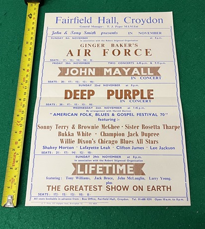 Large original concert flyer (8 1/2"x 12 1/4") for the Fairfield Hall, Croydon, showing gigs for Nov 1970 including in the centre Deep Purple on 22nd Nov 1970.