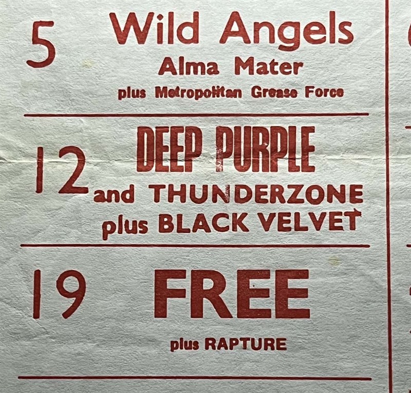This gig came right at the point of commercial breakthrough for Deep Purple. On June 20th just 8 days after this gig, Deep Purple's LP "Deep Purple In Rock" peaked at #4 in the charts & the single "Black Night" later reached #2 in August (their first single hit). Apart from Deep Purple & Free, other noteworthy gigs included Edgar Broughton, Gypsy, Steve Miller, Wild Angels etc.