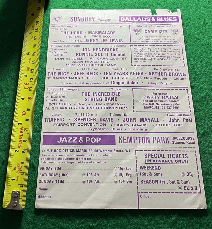 This Festival was noteworthy for several things: it witnessed a very early gig by Deep Purple (they were bottom of the bill on the Saturday & were paid £19 for their performance), ditto early performances by Jethro Tull & Tyrannosaurus Rex, a near riot after Jerry Lee Lewis's performance on the opening night & a partial stage collapse during The Crazy World of Arthur Brown's performance (74 fans hurt!). The full line-up to the reverse also includes the likes of The Nice, Jeff Beck & Traffic.