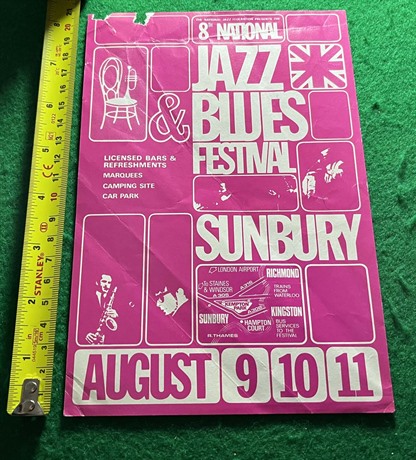 Original double-sided flyer (5 1/2"x 8 1/4") for the 8th National Jazz Blues Festival at Sunbury, Kempton Park, 9th-11th Aug 1968.