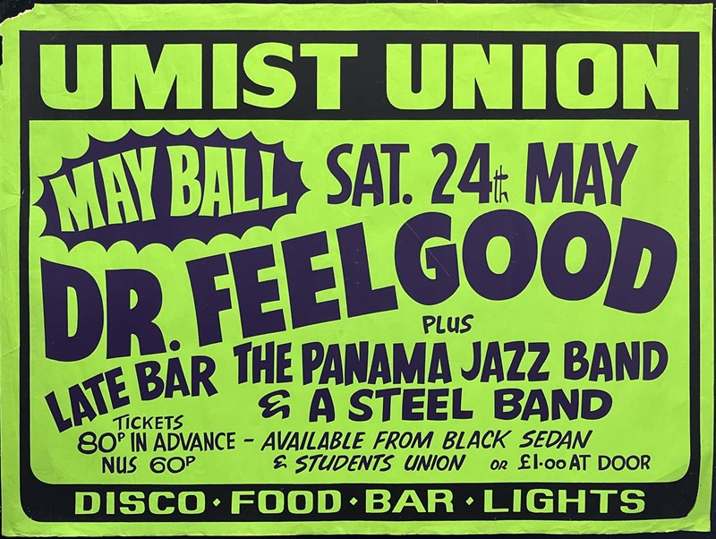 Early Dr Feelgood concert poster (30"x 40" overall) for a gig the UMIST Union ("University of Manchester Institute of Science and Technology") on 24th May 1975.