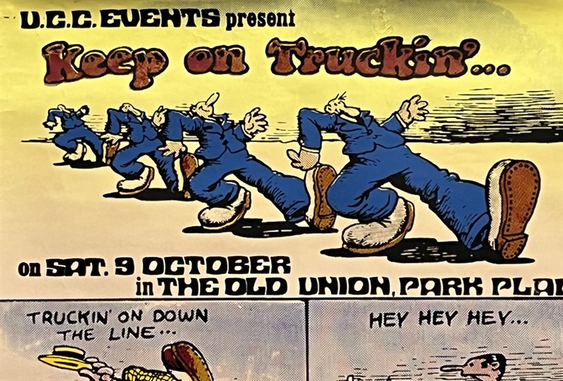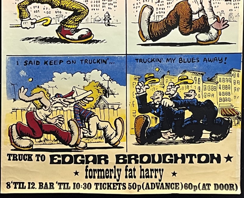 The poster uses the famous Robert Crumb "Keep on Truckin'" cartoon strip which Crumb frst published in issue #1 "Zap Comix" (1968). This cartoon strip became emblematic of the hippie counter-culture era & was much reproduced, as here, though we've never seen another gig poster like this. The support band at this gig was the Country-Rock outfit Formerly Fat Harry.