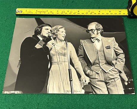 Original photo (8"x 10") of Elton John (wearing a "Captain Famntastic" badge), Radio 1 DJ Alan Freeman & Vera Lynne (presumably taken at a charity event) taken c' 1975 by the renowned rock photographer Dezo Hoffmann.