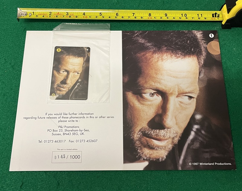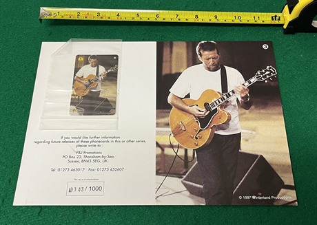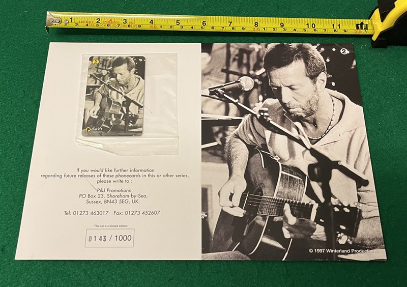 Set of five different Eric Clapton Limited Edition (all #143 of 1000) Phone Cards with original double-sided presentation folders, dating from 1997.