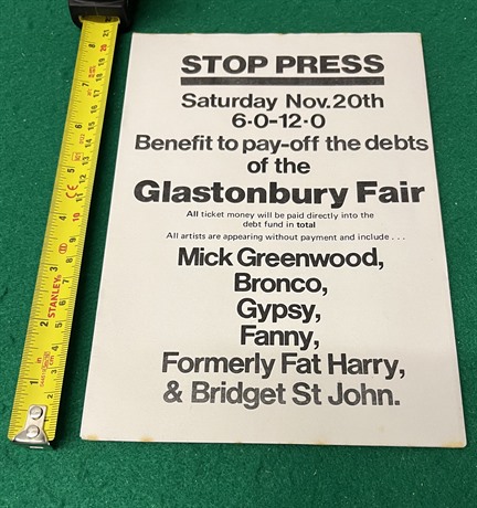 Started in 1970, the nascent Glastonbury Festival was already debt-ridden following the second Festival in June 1971 (at which Bowie appeared). This charity event at the Rainbow included an eclectic cast including Formerly Fat Harry, Bronco, Fanny, Mick Greenwood, Gypsy & Bridget St John.