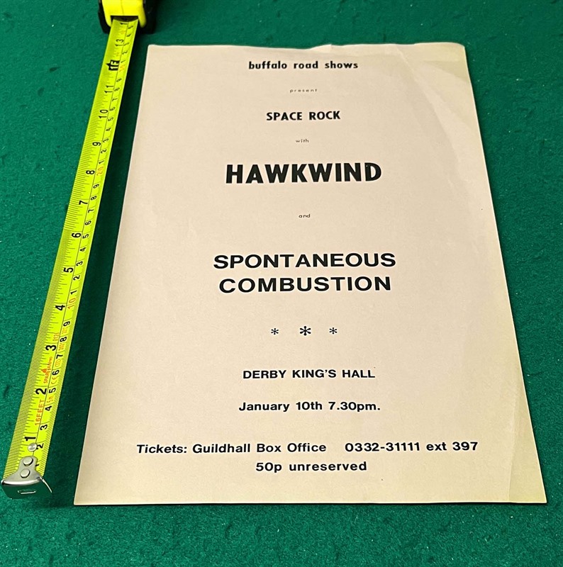 Hawkwind's band of "Space Rock" was supplemented by the psych offerings by Spontaneous Combustion. NB. This appears to be for a previously undocumented gig c' 1972-73 or possibly for a date which was re-scheduled.