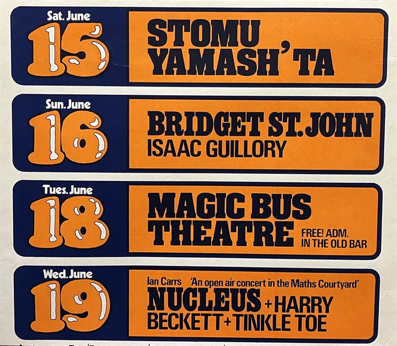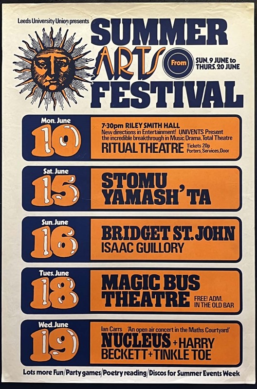 Original Leeds University silkscreen "Summer Arts Festival" poster (20"x 30") for an array of events June 1974, including Ian Carr's Jazz-Rock group Nucleus, the Japanese percussive rock musician Stomu Yamash'ta & folk acts Bridget St John & Isaac Guillory.