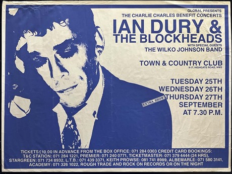 These three benefit gigs were in honour of the Blockheads original drummer, Charlie Charles who died earlier in Sept '90. A poignant poster as this was also one of the last times Dury performed with The Blockheads, deteriorating health meant he gigged little in the 90's (Dury died in March 2000). Wilko Johnson was the support band for these gigs. What a combination!