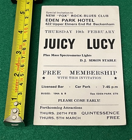 Juicy Lucy card flyer (3 1/2"x 5 1/2") for a gig at the Eden Park Hotel, 19th Feb 1970.