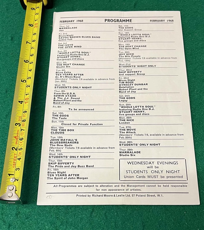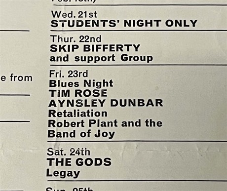 Way before Plant found fame with Led Zep he was a relative unknown in the Band of Joy but on 23rd Feb 1968 Robert Plant & The Band of Joy were third on the bill of a "Blues Night" at the Marquee, supporting Aynsley Dunbar's Retaliation & Tim Rose & again as support for Edwin Starr on a gig on 8th Feb too.