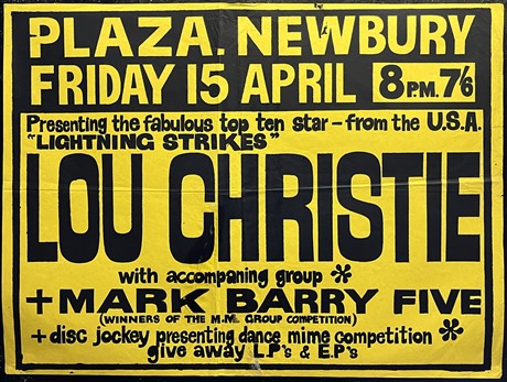 This is an unusually large "Quad" sized gig poster. American singer Lou Christie was best known at this time for the excellent "Lightning Strikes" which is also referenced on the poster. Christie was supported by The Mark Barry Five.