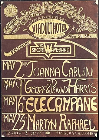 Interesting Folk music poster (16 1/2"x 23 1/4") for "The Sunday Joint" at the Viaduct Hotel, Limpley Stoke, Bath, for gigs in May 1971.