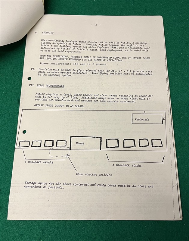 Iron Maiden, who closed the previous night. Also of interest is all the technical information about the staging of the show & the catering rider - in amongst the booze, the only "VERY IMPORTANT" beverage indicated is "6 quarts lime or orange Gatorade" !