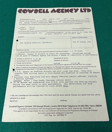 Fascinating 7-page contract & riders for the Michael Schenker Group ("MSG") to headline the last day of the Reading Rock Festival on 29th Aug 1982.The band were paid
