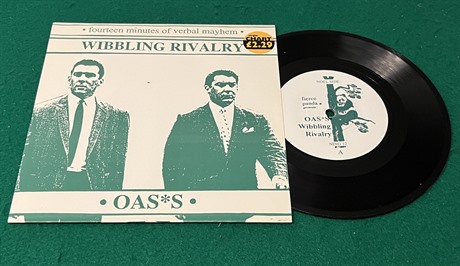 Oasis UK 7" vinyl record for "Wibbling Rivary" ("Liam Side" on the B-side) issued on Fierce Panda NING 12 in 1995, this being the first pressing (of 1,000 only) in stickered picture sleeve without bar code.