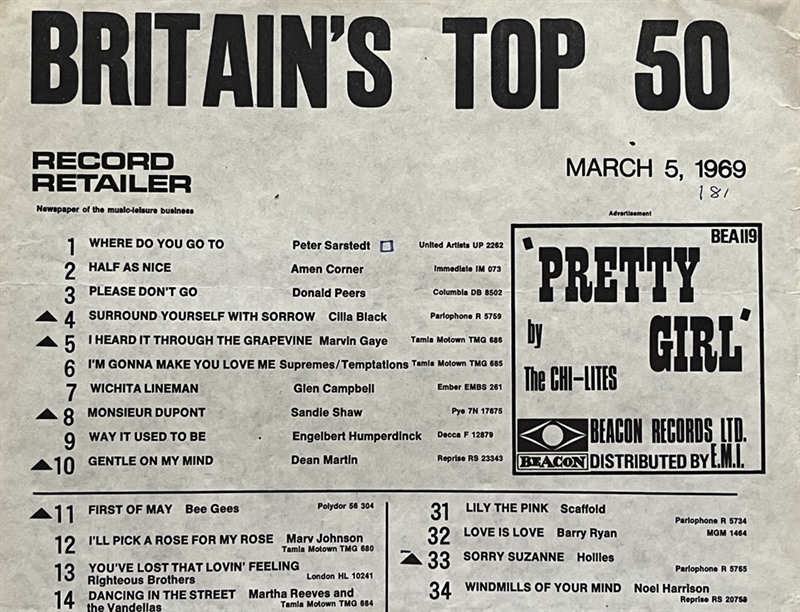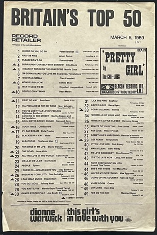 This highly distinctive single remained at the top of the UK charts for four weeks. Other acts in the Top 10 during the week of 5th March '69 included Amen Corner, Marvin Gaye, The Supremes/Temptations, Cilla Black, Sandie Shaw etc.