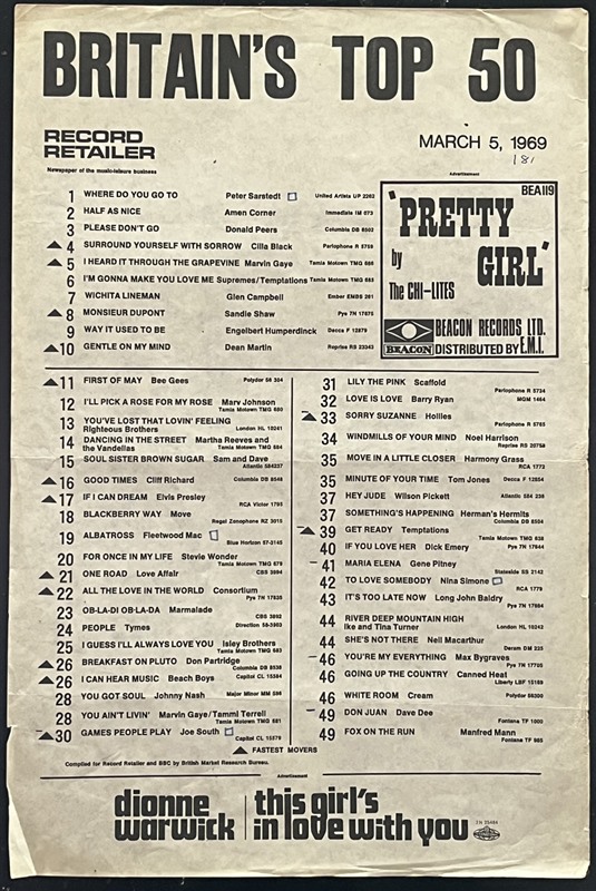 Original "Top 50" Record Shop poster (11"x 17") for the week of 5th March 1969 with Peter Sarstedt at #1 with "Where Do You Go To".