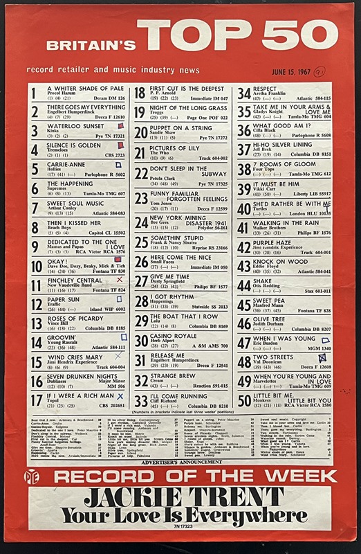 Original "Top 50" Record Shop poster (11 1/4"x 17 1/4") for the week of 15th June 1967 with "A Whiter Shade Of Pale" topping the charts at #1.