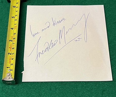 A Freddie Mercury autograph on a piece of notepaper (5 1/2"x 6"), additionally annotated "love and kisses", c'early 1980's.