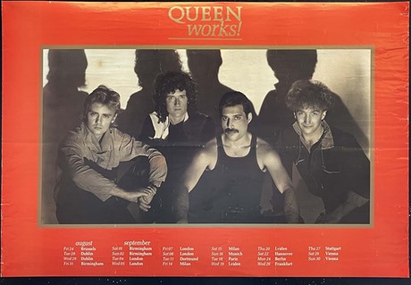 Queen "Works" 1984 European Tour poster (18 3/4"x 27 1/2").The poster presents a publicity photo of the band with the 23 dates on the Tour