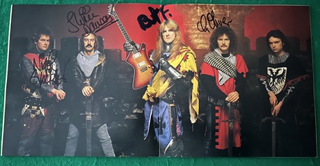 A 1984 "World Crusade" Saxon Tour Programme which has been boldly Autographed by the entire band: Biff Byford, Steve Dawson, Graham Oliver, Paul Quinn (signed in biro but still fine & clear) & Nigel Glockler.