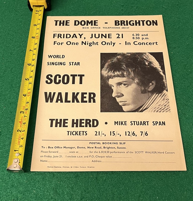 Large Scott Walker concert flyer (7 1/2"x 10") for The Dome, Brighton, 21st June 1968 with The Herd & Mike Stuart Spann as support.