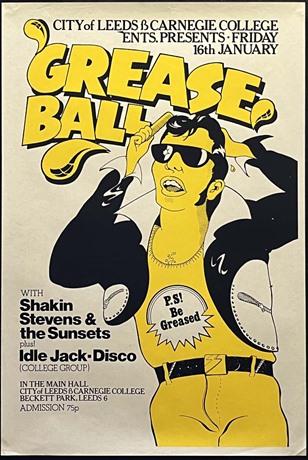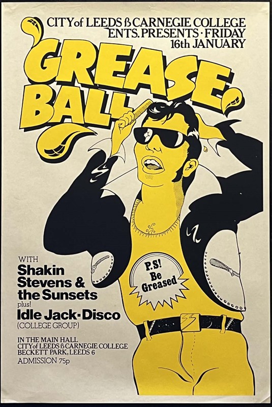 Original (early era) Shakin Stevens & The Sunsets "Grease Ball" concert poster (20"x 30"), for a gig at Leeds Carnegie College, 16th Jan 1976, presenting an image of a suitably greased back Elvis like rocker!