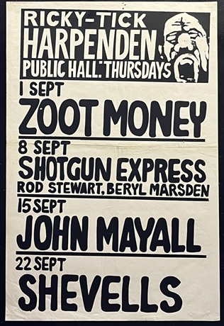 Original Ricky-Tick concert poster (20"x 30") for gigs at Harpenden Public Hall during Sept 1966, including Shotgun Express, the poster name-checking a very young Rod Stewart!