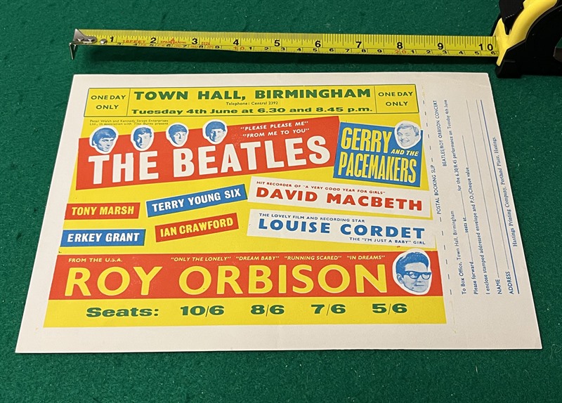 Original Beatles concert flyer (7"x 10") for their UK Tour with Roy Orbison, May-June 1963, this for the gig at the Town Hall, Birmingham on 4th June 1963.