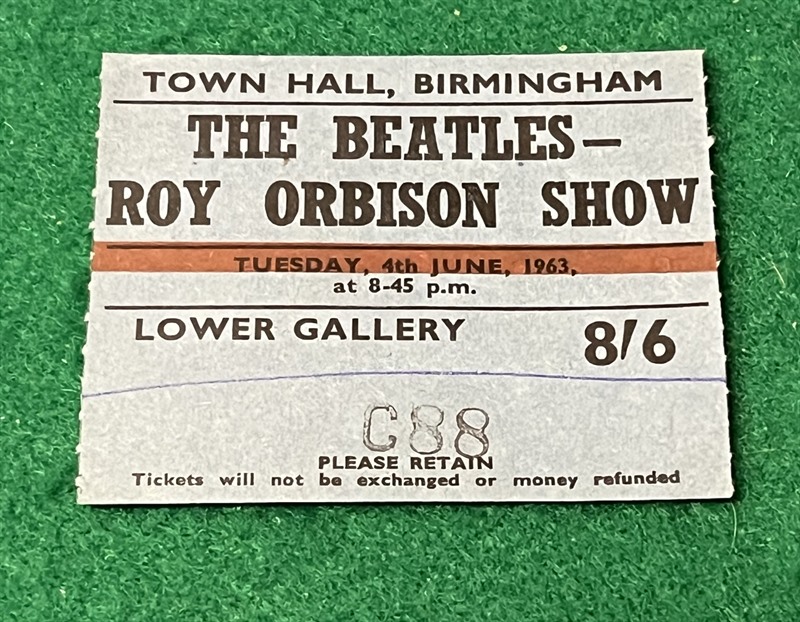 Original Beatles concert ticket (2 1/2"x 3") for their UK Tour with Roy Orbison, May-June 1963, this for the gig at the Town Hall, Birmingham on 4th June 1963.