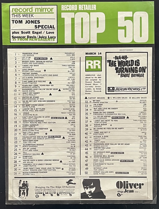 Original "Top 50" Record Shop poster (11"x 14 1/2") for the week of 14th March 1970 with The Beatles "Let It Be" at #2 & Lee Marvin's "Wanderin' Star" at #1.
