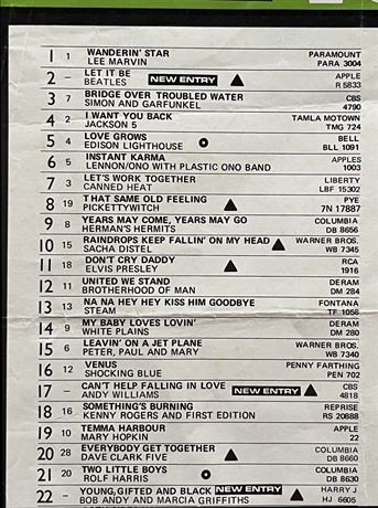Other acts in & around the top of the charts at this time included Simon & Garfunkel, The Jackson 5, Elvis Presley & John Lennon with "Instant Karma" (another indicator of the impending break-up of The Beatles which was marked by Paul McCartney's announcement of this on Apr 10th 1971).