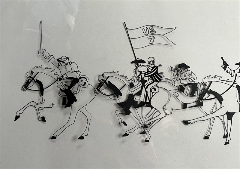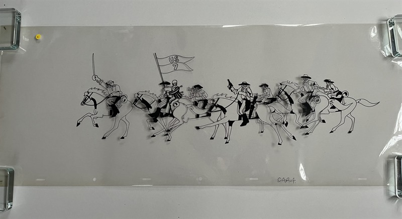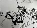 Original animated hand-drawn artwork from The Beatles film "Yellow Submarine" (1968) featuring the scene where Ringo Starr appears in a Cavalry charge, Ringo depicted here with two arrows in his back.This artwork is on two stapled acetate sheets (12 1/2"x 32" approx). This item belonged to the commercial artist Corona Maher who worked at