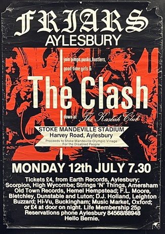 This was a special charity event designed to raise funds for the Stoke Mandeville Olympic Village. Friars normally (at this time) held their gigs at the Aylesbury Civic Centre but the newly completed SM Stadium offered a larger capacity of 3,000, hence the change of venue. The special nature of the gig also resulted in a departure from the normal design of Friars gig posters, this example also printed on a semi-gloss paper.