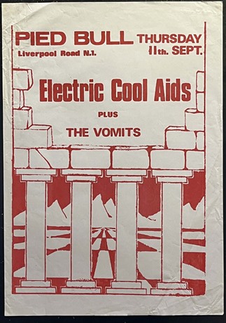 We have been unable to ID the Electric Cool Aids but The Vomits were a Punk band from Congleton, Cheshire. The Pied Bull was a well known music venue in Angel, North London & later became a key London lesbian club.