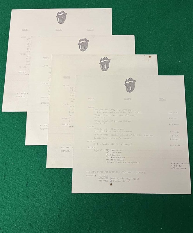 Each shows the rental rates for hire of equipment (Ampeg, Fender, Hammond, Gretsch etc), with the Stones "tongue" logo at the top & the tel # of the Stones office at the bottom. When Jagger moved to Stargroves, Hampshire in 1970 he wanted to start recording there. At this point, the Stones commissioned the building of a Mobile Recording Studio in a lorry. The idea proved popular & various classic LP's were recorded using this facility including The Stones ("Sticky Fingers" & "Exile on Main St"), Led Zeppelin (III & IV), Deep Purple ("Machine Head") & others by the likes of The WHO & The Faces.