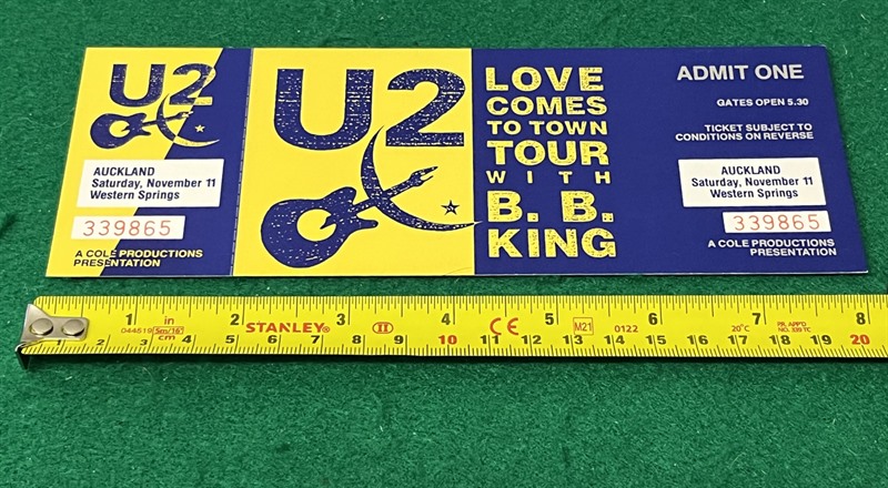 The ticket comes with perforated portion still intact. This gig was part of U2's "Love Comes To Town" World Tour. U2 played 20 songs in their set. BB King was support.