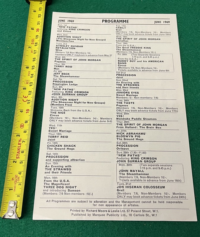 To the reverse is the June 1969 roster of artists playing the Marquee, including YES, King Crimson, Family, Jeff Beck, Taste, MAN etc. "Yes!" played two Marquee gigs during June '69, on the 11th & again on the 25th.