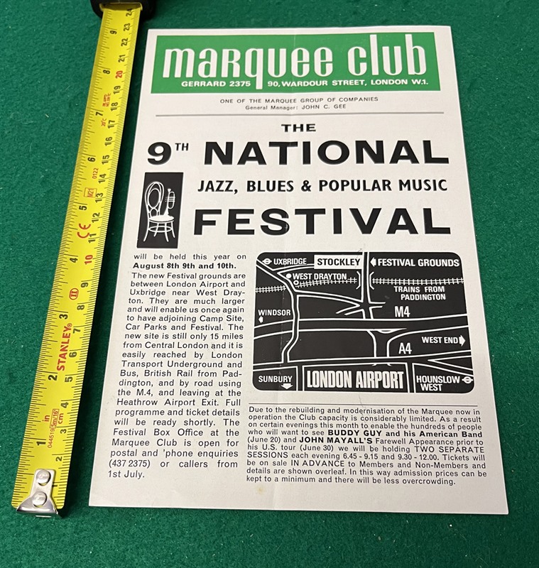 Original double-sided flyer (6"x 9") for The Marquee Club, announcing the 9th National Jazz, Blues & Pop Festival, West Drayton 8th-10th August 1969.