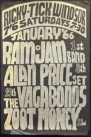 Original Ricky-Tick Windsor concert poster (20"x 30") for gigs Jan 1966 including Zoot Money, Alan Price, the Ram Jam Band, & The Vagabonds.A typical Ricky-Tick poster, silkcreen printed & with primitive but idiosyncratic graphics, this poster has added interest as it is for gigs at the "home" of the Ricky-Tick circuit, Windsor. At the time of the Zoot Money gig,